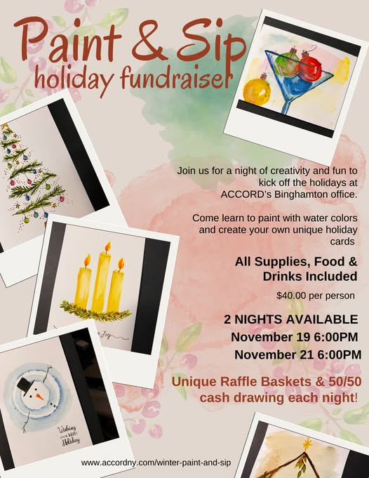 HOLIDAY CARD PAINT & SIP FUNDRAISER ACCORD is hosting the fabulous Therapeutic Arts for TWO Holiday Card Paint & Sip evenings. Your ticket will include: Watercolor lesson 10 Blank Cards 10 Blank Envelopes Food & drinks PLUS We will have unique gift baskets and a 50/50 cash drawing each night. Visit: www.