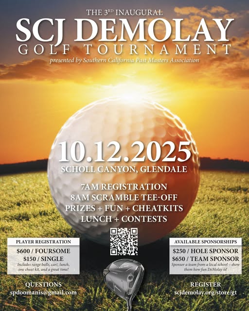Tee off for a great cause. Join Masons for the 3rd Inaugural SCJ DeMolay Golf Tournament, presented by the Southern California Past Masters Association. Enjoy a day of fun, prizes, contests, and camaraderie—all in support of #DeMolay youth leadership.
