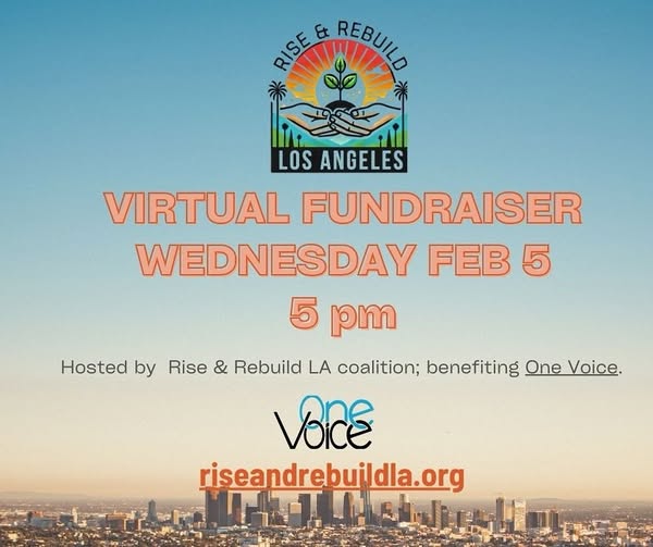 📢 Join Us for a Virtual Fundraiser. Our friends at Rise and Rebuild LA are hosting a fundraiser to support One Voice’s Fire Relief Fund, providing direct assistance to domestic workers who lost their jobs due to the LA wildfires. 📅 Wednesday, February 5 ⏰ 5:00 PM PT 📍 Zoom 🔗 RSVP: www.