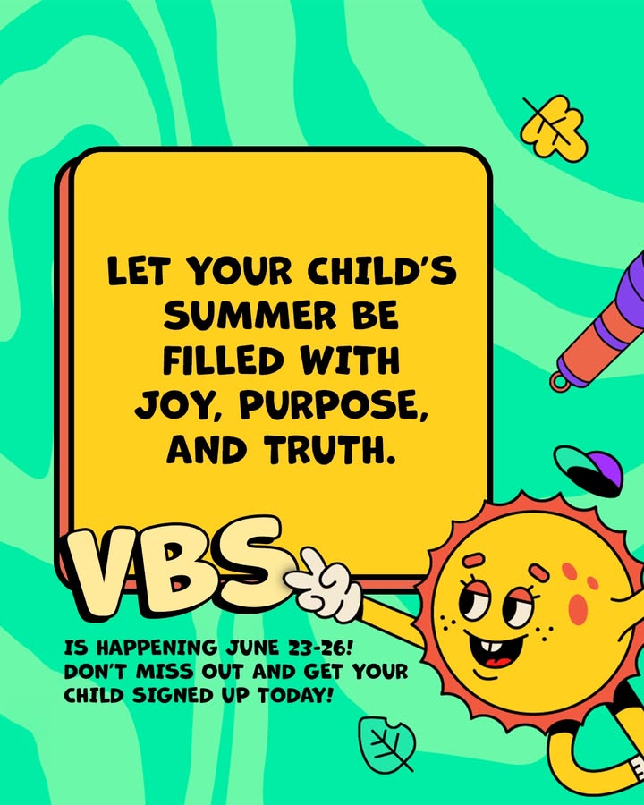Grab your sneakers and your biggest smile – VBS is happening June 23–26 and YOU’RE invited. There’ll be: Games, singing, crafts, Bible fun and NEW FRIENDS waiting to meet you. 6–8 PM nightly (doors open at 5:30) Ages 4-13 $10 registration (t-shirts sold separately) Sign up: www.