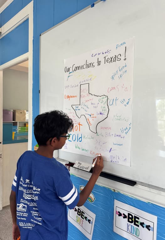 Fourth graders dove into history/social studies class earlier this week with a lesson close to home by exploring 'Our Connections to Texas. ' They discussed the physical things that make Texas unique, like the topography of the Hill Country, tumbleweeds, mockingbirds, and hot weather. Students also thought about what being a Texan means to them individually and how we connect with others in our beautiful state, such as through eating BBQ, fishing, kayaking, and watching football together.