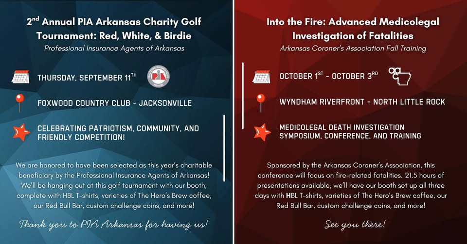 Our upcoming September and October events. Thank you to Pia Arkansas and Arkansas Coronersโ Association for having us. If you still need one of our new T-shirts, a challenge coin, some of our Heroโs Brew coffee, or a boost of energy at the HBL Red Bull bar, weโll see you there.