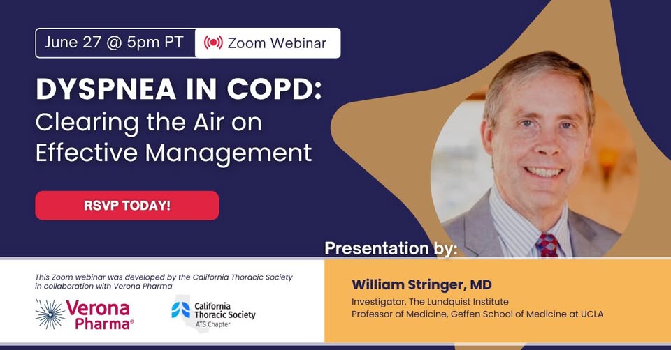 It's not too late to register to attend tonight's webinar at 5pm PT. Topic: Dyspnea in COPD: Clearing the Air on Effective Management Presenter: William Stringer, MD Investigator, The Lundquist Institute Professor of Medicine, Geffen School of Medicine at UCLA Click here to register: https://bit. ly/cts-webinar-june-27-2025 This is a non-CME event.