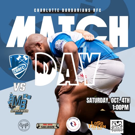 🚨 Match Week 🚨 The Charlotte Barbarians head to the coast to take on Myrtle Beach RC. CBRFC @ Myrtle Beach Rugby Club 🏉 Kickoff: 1:00pm, Saturday, October 4th 📌 Pitch: South Strand Rec Center - 9650 Scipio Lane 🍺 Social: Voodoo Brewing Thank you to our sponsors: Epps HVAC Co Two Buck Saloon Great Wagon Road Distilling Co. NoDa Moosehead Bar & Grill LoSo Tavern.