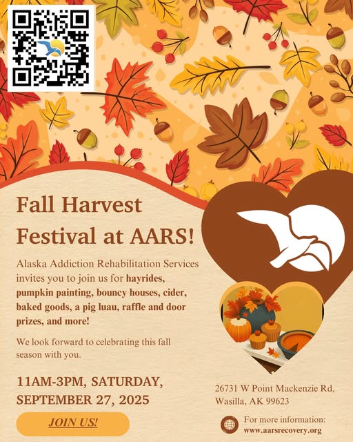π Save the Date for AARSβ Fall Harvest Festival. π π Saturday, September 27, 2025 π 11:00 AM β 3:00 PM π Alaska Addiction Rehabilitation Services Grounds (Wasilla, AK) We invite you to participate in a free, family-oriented event celebrating recovery and fostering connections within the community. Participate in hayrides, pumpkin painting, games, and enjoy delicious food, along with a raffle and additional activities as we come together to promote healing and hope.