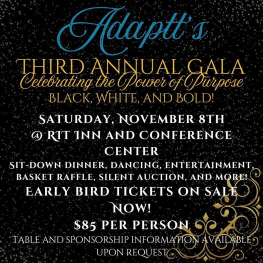 *** LAST CHANCE FOR DISCOUNTED TICKETS. *** Tickets for Adaptt's 3rd Annual Gala, Celebrating the Power of Purpose, Black, White, and Bold are reduced to $85 through Saturday, September 20th ONLY. Join us for an amazing evening, Saturday, November 8th, from 5 pm - 11 pm at the RIT Inn and Conference Center.