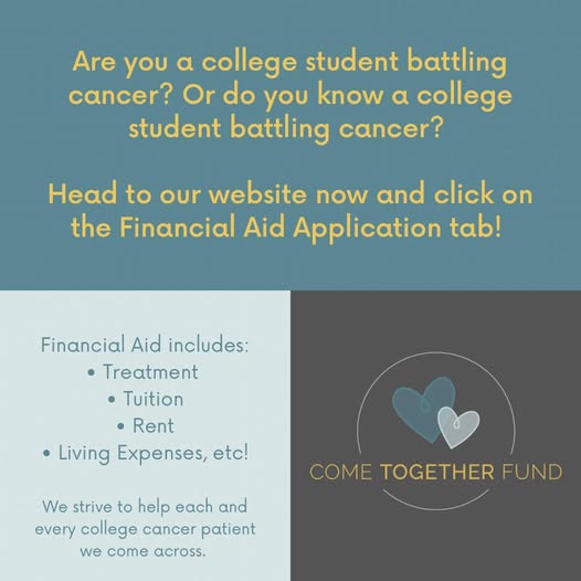 Come Together Fund Come Together Fund Come Together Fund Letx27s Come Together to Help College Students with Cancer A studentran 501c3 aiding collegeaged cancer students both financially and emotionally Our Team Our History Our History The Come Together Fund is a studentran nonprofit organization. Each of our team members are excellent and committed workers who are striving to leave their impact on the world. The team has the best interests of our applicants and donors in mind and promises to uphold our mission values. Our History Our History Our History After seeing a lack of resources available to collegeage cancer patients we created the Come Together Fund.