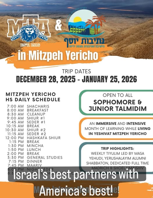 MTA is excited to announce the launch of our new Israel exchange program. This December, we will send a group of sophomore and junior talmidim to participate in an immersive learning and living experience at one of Israel’s premiere, most elite yeshiva high schools. More details to come - application opens soon.