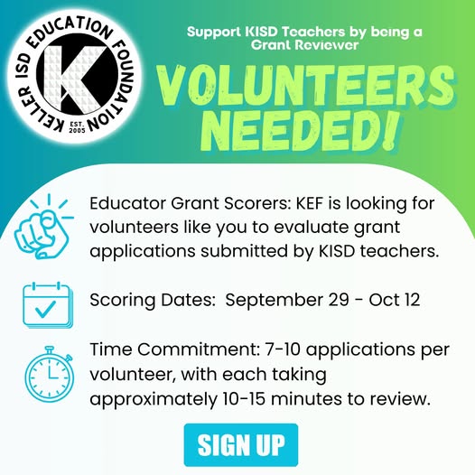 🌟 We need YOU to help shape the future of education in Keller ISD. 🌟 We’re looking for enthusiastic volunteers to help score teacher grant & scholarship applications. By lending just a little of your time, you’ll play a BIG role in bringing our teachers’ most creative and innovative ideas to life.
