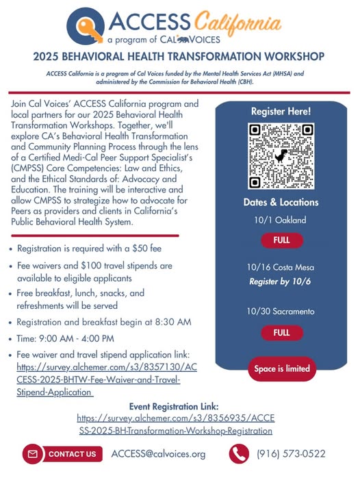 Cal Voices’ ACCESS California program is on the road for our 2025 Behavioral Health Transformation Workshop Series. Register while there’s still spots available at our Costa Mesa event. Join us for a powerful, peer-driven workshop exploring California’s Behavioral Health Transformation through the lens of a Certified Medi-Cal Peer Support Specialist (CMPSS).