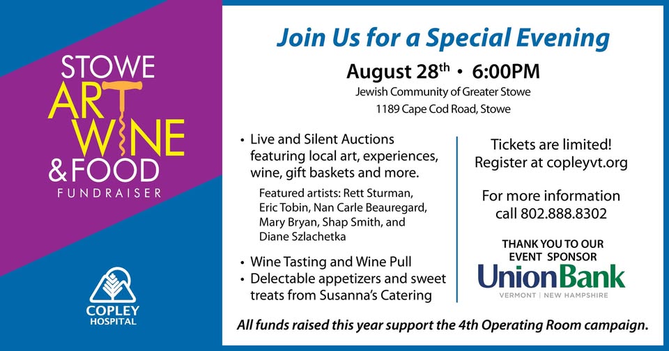 The 4th Annual Stowe Art, Wine & Food Fundraiser will be a fun-filled evening that brings us together to raise essential funds for our community hospital. In addition to live and silent auctions featuring local artwork, experiences, and wines, attendees will enjoy sampling delectable appetizers prepared by Susanna's Catering and a guided wine tasting by Farrell Distributing. Join Event Chair Riki French and many others in supporting Copley while raising money for our 4th Operating Room campaign.