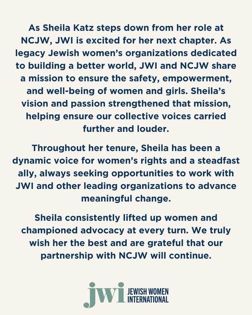 As Sheila Katz steps down from her role at NCJW, JWI is excited for her next chapter. As legacy Jewish women’s organizations dedicated to building a better world, JWI and NCJW share a mission to ensure the safety, empowerment, and well-being of women and girls. Sheila’s vision and passion strengthened that mission, helping ensure our collective voices carried further and louder.