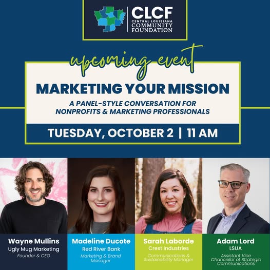 Are you a nonprofit or marketing professional struggling to make your mission known. Our next Connect for Good event is all about MARKETING YOUR MISSION. ๐ Join us for an inspiring panel discussion featuring some of Central Louisianaโs top marketing leaders.