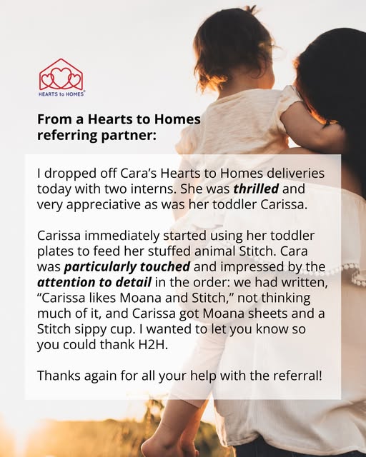 Stories like this always remind us why we do what we do at Hearts to Homes. 💙 When our team learned that the child of one of our recipients was a big fan of Moana and Stitch, we wanted to make sure we got this detail right. We not only provide necessities but make sure to do so with attention and intentionality to help our recipients and their families feel at home.