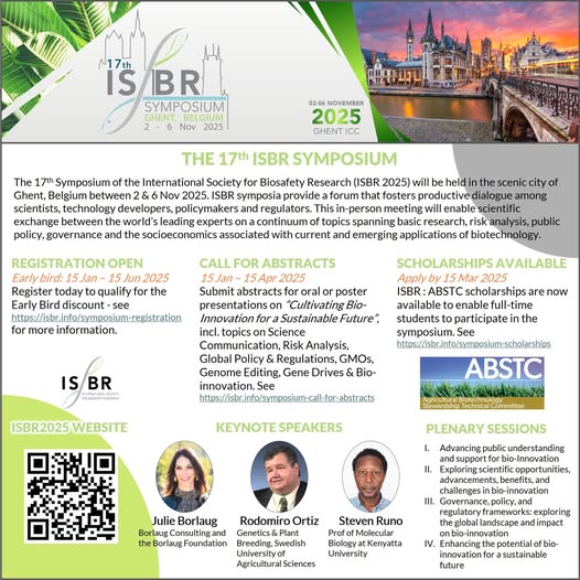 Home Symposium Publications Members Latest News ISBR2025 Newsletter Vol. 24 LATEST 17thISBR SYMPOSIUM NEWS ISBR2025 Newsletter Vol. 23 LATEST 17thISBR SYMPOSIUM NEWS ISBR2025 Newsletter Vol. 22 LATEST 17thISBR SYMPOSIUM NEWS About Us The International Society for Biosafety Research ISBR aims to promote scientifically sound research that supports biosafety assessment by improving communication among scientists who study plants animals and microbes using modern biotechnology.