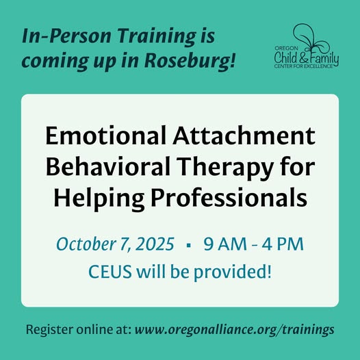 @followers Calling all residents in Roseburg and surrounding areas. Doug Smith is returning with another iteration of his Emotional Attachment Behavioral Therapy (EABT) model with "Emotional Attachment Behavioral Therapy for Helping Professionals" on October 7, 2025. This training invites participants to reflect on how their personal attachment patterns may influence their work with clients, their relationships with colleagues, and their ability to care for themselves.