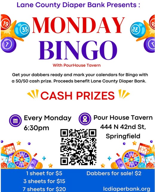 🎯 BINGO Night for a Cause. 🎯 Join the Lane County Diaper Bank every Monday at 6:30 PM at PourHouse Tavern in Springfield. 💰 50/50 Cash Prize 📝 1 sheet = $5 | 3 sheets = $15 | 7 sheets = $20 🎨 Dabbers for sale: $2 Proceeds support families in need.