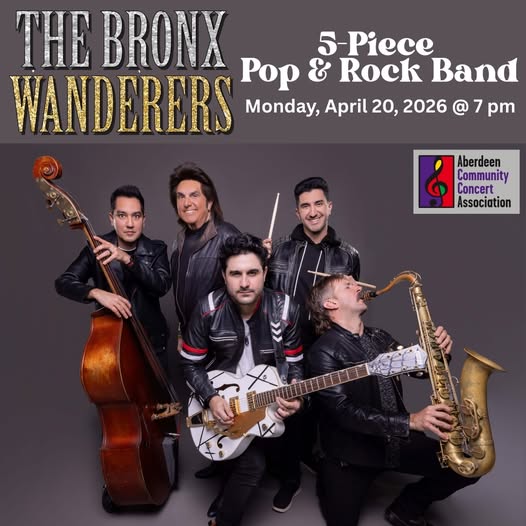 The Bronx Wanderers will round up the 2025/2025 Aberdeen Community Concert Association concert series. Get ready, they bring their legendary, high-energy rock & roll show to our stage in April of 2026. From “Don’t Worry Baby” to “Bohemian Rhapsody,” this father-and-sons band (plus a couple of lifelong friends) takes you on a musical journey through six decades of rock and pop hits.