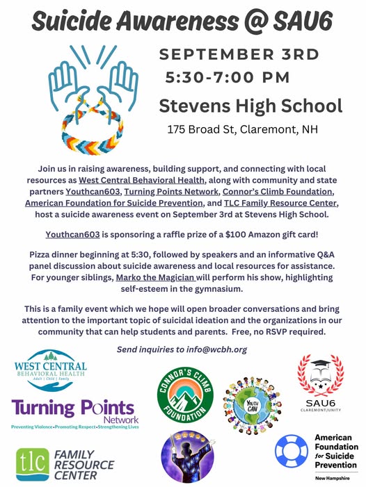 Join us at Stevens High School in the gym on Wednesday, Sept. 3 as we raise awareness and support around the issue of mental health and suicide prevention. TPN will have a table at this event from 5:30 to 7:00 pm and will be offering information on teen mental health first aid and tips for creating healthy relationships.