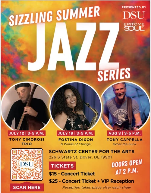 🎶 Join Us for the DSU Sizzling Summer Jazz Series. 🎶 DSU and Epitome of Soul present the Sizzling Summer Jazz Series—a three-concert celebration of sound, soul, and community. 🎷 🗓️ July 12: Tony Cimorosi Trio featuring Candace Culcleasure, Nat Janoff (NYC), and Kevin James (Philly) 🗓️ July 19: Fostina Dixon and her phenomenal ensemble Winds of Change 🗓️ August 3: Tony Capella brings the funk with What the Funk 📍 Schwartz Theater, Dover, DE 🕒 3–5 PM | Reception to follow each event 🎟️ Ticket Info: www.
