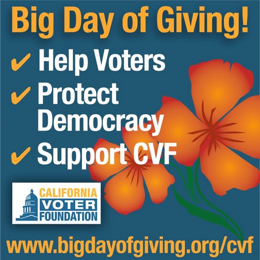 Today is Big Day of Giving and the California Voter Foundation is joining with hundreds of other Sacramento-based nonprofits asking folks to donate. CVF needs your support for our work serving voters and protecting elections. As a small but mighty non-profit, every dollar donated truly makes a difference.