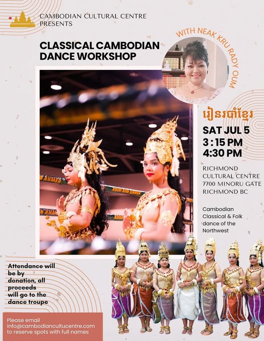 We are pleased to announce that neak kru (teacher) Rady Oum from Cambodian Classical Folk Dance Northwest of Tacoma, Washington will be hosting a workshop here in BC. We would love for you to join us as we plant seeds and lay the foundation for classical Khmer dance here in greater Vancouver. You will learn the basics of dances that have endured for centuries.