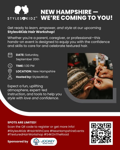New Hampshire, get ready. πππ½ββοΈ Styles 4 Kidz is coming your way with a hands-on hair workshop designed to help caregivers and professionals build skills, boost confidence, and celebrate textured hair with care. π Saturday, Sept 20 β° 1:30 PM ππΎ Sponsored by Jockey Being Family Spots are limited, register today at: https://app.