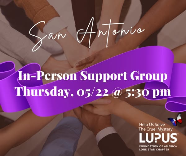 📣 San Antonio Lupus Warriors. Join Us This Thursday. 💜 Our in-person support group is happening this Thursday, May 22 from 5:30 PM to 6:30 PM at: 📍 Arthritis Associates 4511 Horizon Hill Blvd, Suite 150 San Antonio, TX 78229 🩺 Topic: “What Your Doctor Wants You to Know About Lupus” Come connect with others who understand the journey, learn valuable insights, and feel supported in your fight against lupus.