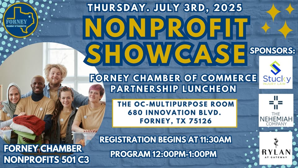 We have some amazing local nonprofits that we can't wait to showcase tomorrow at our Forney Chamber of Commerce-July 2025 Partnership Luncheon. If you would like to join us for lunch, networking, and learning about these incredible businesses, make sure to RSVP ASAP at this link: https://forneychamber. com/events/details/july-partnership-luncheon-2025-1282 Looking forward to seeing everyone tomorrow.