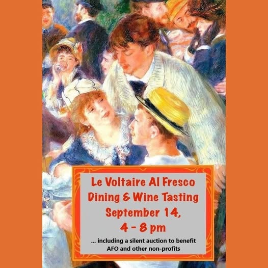 Join us at Le Voltaire French Restaurant for our a delightful SEPTEMBER AL FRESCO DINING & WINE TASTING EVENT Le Voltaire French Restaurant 's Al Fresco dining event this year is Sunday, September 14th 4p - 8p. Location: Trifaith Campus on 132nd and Pacific streets. Note the new location to accommodate easy access and increasing popularity of the event.