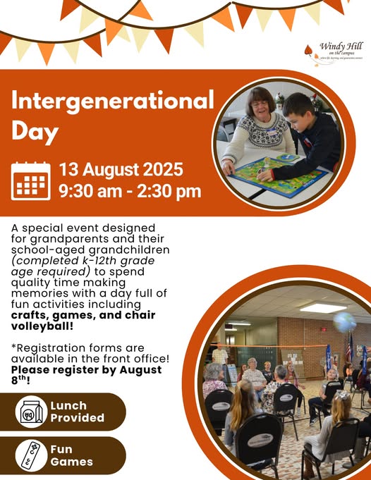 Registration forms are available in our front office and on our website for Intergenerational Day at Windy Hill on the Campus. 🎉 This is a special event for grandparents to make memories with their grandchildren in a fun day full of crafts, games, and chair volleyball. Register online at: https://windyhillonthecampus.