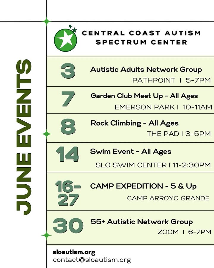 π June with CCASC. π Join us for a month full of connection, fun, and community β for all ages and abilities. π ποΈ Upcoming Events β June 3 β Autistic Adults Network Group π PathPoint, SLO | β° 5β7PM | π― Adults β June 7 β Garden Club Meet Up π Emerson Park, SLO | β° 10β11AM | π― All Ages β June 8 β Rock Climbing π The Pad, SLO | β° 3β5PM | π― All Ages β June 14 β Swim Event π SLO Swim Center | β° 11AMβ2:30PM | π― All Ages β June 16β27 β Camp Expedition π Camp Arroyo Grande | π― Ages 5 & Up β June 30 β 55+ Autistic Network Group π Zoom | β° 6β7PM | π― Adults 55+ π© Questions.