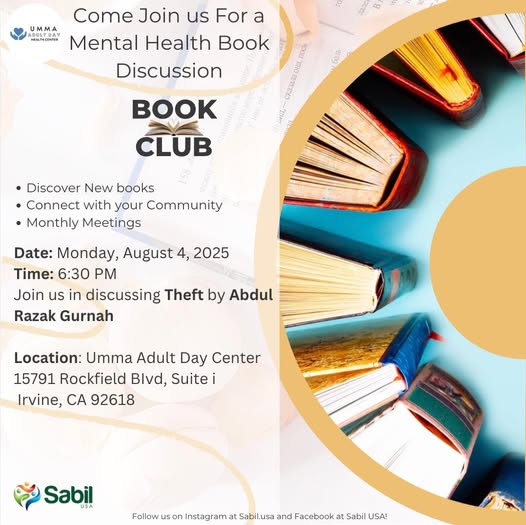 π Join us for a meaningful evening of connection and conversation at our Mental Health Book Club. This month, weβll be discussing Theft by Abdul Razak Gurnah β a powerful story of identity, memory, and belonging. π Date: Monday, August 4, 2025 β° Time: 6:30 PM π Location: Umma Adult Day Center 15791 Rockfield Blvd, Suite I, Irvine, CA 92618 β¨ Discover new books π€ Connect with your community π Monthly discussions that nurture mental wellness #SabilUSA #BookClub #MentalHealthMatters #HealingThroughBooks #CommunityWellness #IrvineEvents #ReadTogether #AbdulRazakGurnah #Theft #UmmaCenter #SupportEachOther #WellbeingThroughReading.