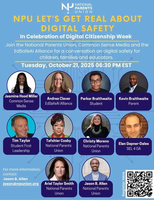 📆SAVE THE DATE: Tuesday, October 21 | 6:30 PM ET Join us as we team up with Common Sense Media and EdSafeAI for an important conversation on digital safety for families, advocates and educators. In an age where technology and AI shape so much of our kids’ lives, this event will focus on the tools, knowledge, and shared responsibility we need to keep them safe online and in classrooms. We’ll also be unveiling a new AI Digital Safety Toolkit, designed to empower parents, teachers and advocates with clear, actionable guidance to navigate AI responsibly and protect young people.