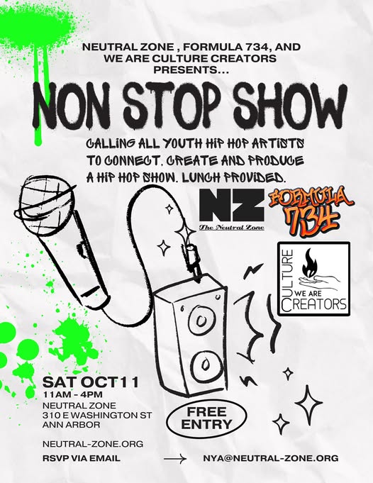 CALLING ALL YOUTH HIP HOP ARTISTS IN THE AREA. Neutral Zone, My Brothers Keeper Formula 734 and We Are Culture Creators are collaborating on a Hip Hop showcase and we’re looking for youth and adults to celebrate the creativity of the youth in our community through hip hop. We are seeking freestyle ciphers, DJs, graffiti artists and more to create original artistic pieces together.