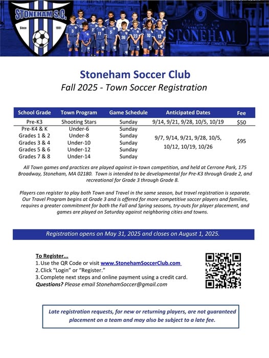 Stoneham Soccer Club Social Media Page is to promote and share all the great things happening in the Stoneham Soccer Community.