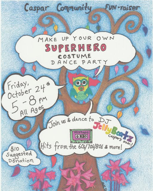 Come shake it at the Caspar Community Center Friday, October 24th 5pm-8pm at the: Make your own SUPERHERO costume dance party. All ages and all kinds of hero costumes are welcome Dance, dance and dance with DJ Jelly Beatz spinning favorite hits from the 60's, 70's, 80's and beyond.