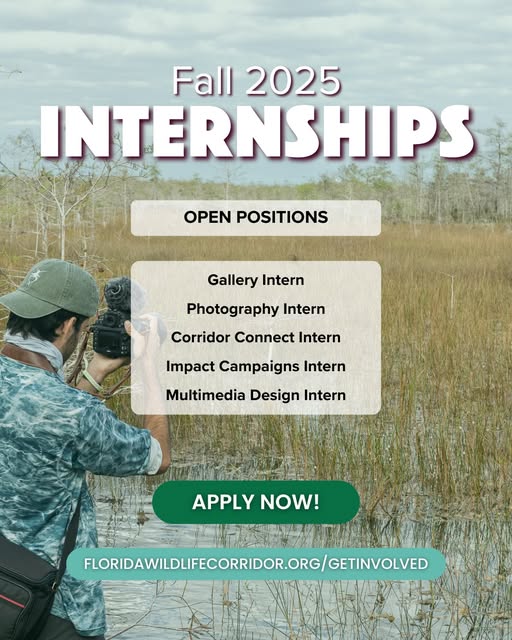 Interested in a paid internship with the Florida Wildlife Corridor Foundation. 🌿 We are seeking passionate interns to join our Gallery, Photography, Design, Impact Campaigns, and Corridor Connect needs for the Fall 2025 Semester. Interns will work 20 hours per week in a flexible, paid position ($15/hour).