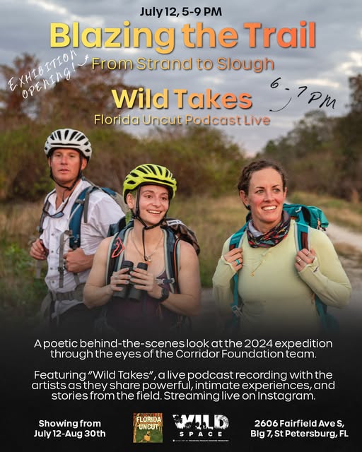 Wild Space Gallery presents "Blazing the Trail: From Strand to Slough", a behind the scenes view of the epic trek through the western edge of the Florida Wildlife Corridor in southwest Florida, from the eyes of the Corridor Foundation team, who planned, managed and participated in the expedition. Through photographs, ephemera, stories and videos, "Blazing the Trail" invites you to vicariously follow in the footsteps of the crew and join in the exploration, discovery, and conservation of at-risk lands and waters in wild Florida. The evening features a live recording of "Wild Takes: Florida Uncut Podcast", with host, producer and creator Mason Gravley.