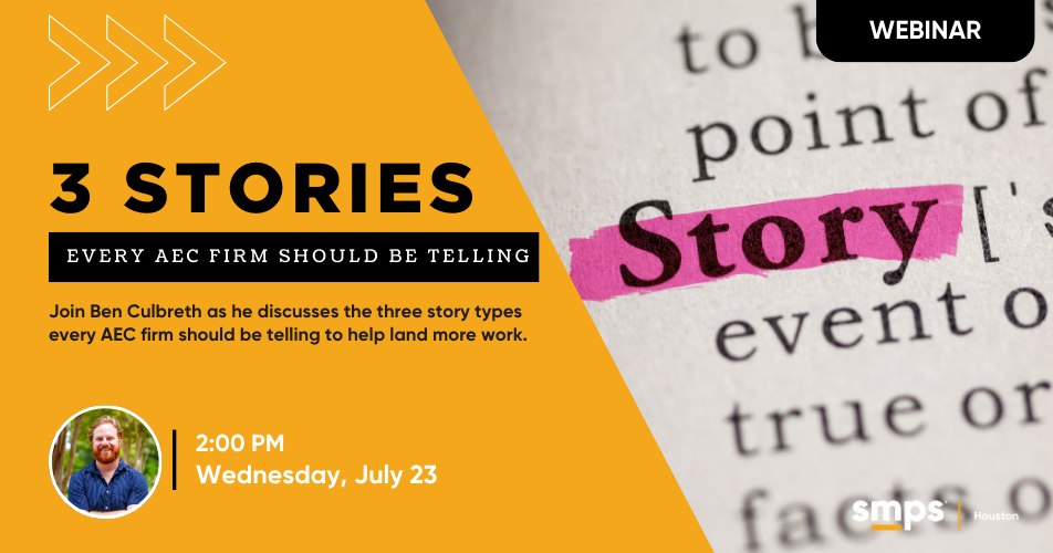 Join Benjamin Culbreth on July 23rd for a webinar: Three Stories Every AEC Firm Should Be Telling AEC firms are sitting on incredible untold stories. However, most firms aren’t sharing these stories, even though they can help secure more work, build a stronger public brand, and attract top talent. Register on the SMPS Houston website now.