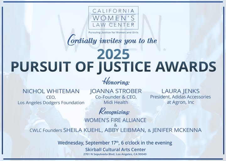 📣 Join us in the Pursuit of Justice. The California Women’s Law Center is proud to announce the 2025 Pursuit of Justice Awards, taking place on September 17 at the Skirball Cultural Center in Los Angeles. This unforgettable evening will celebrate visionary leaders advancing gender equity and justice — from Title IX and reproductive rights to workplace fairness, public safety, and systemic reform.