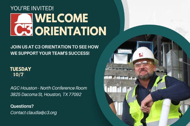 📣 Join Us for C3 Orientation. We’re excited to welcome you to our upcoming C3 Orientation on Tuesday, October 7th, at AGC Houston. This session is ideal for Office Administrators, Safety Professionals, Project Managers, HR Representatives, and Training Managers who want to gain a deeper understanding of the C3 process and its role in supporting workforce success.