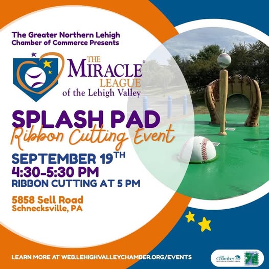 PRESS RELEASE: Miracle League of the Lehigh Valley to Host Ribbon Cutting for New Accessible Splash Pad Miracle League of the Lehigh Valley to Host Ribbon Cutting for New Accessible Splash Pad Allentown, PA β September 19, 2025 β The Miracle League of the Lehigh Valley is excited to announce the official ribbon cutting of its brand-new fully accessible splash pad, designed to bring inclusive outdoor fun to children and adults of all abilities. The celebration will take place on Friday, September 19, 2025, from 4:30β5:30 PM, with the ribbon cutting scheduled for 5:00 PM at the Miracle League Field, 5858 Sell Rd. , Schnecksville, PA.