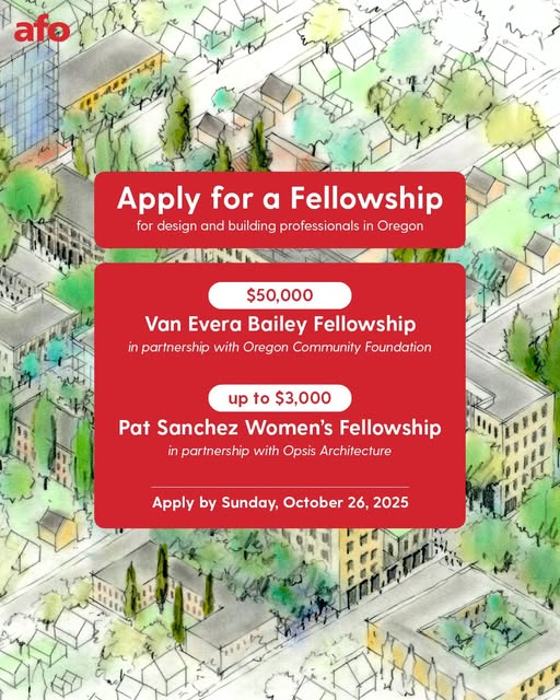 Are you a design or building professional contributing to Oregon's built environment. Explore our two unique fellowship opportunities to advance your career. AFO offers two fellowships: the $50,000 Van Evera Bailey Fellowship in partnership with the Oregon Community Foundation and the up to $3,000 Pat Sanchez Women’s Fellowship in partnership with Opsis Architecture.