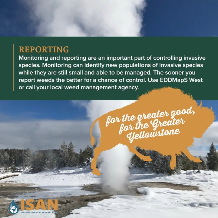 Reporting suspected invasive species is a very important part of protecting the Greater Yellowstone Ecosystem (GYE). Monitoring and reporting are critical parts of controlling invasives. If invasive species are not controlled, they can reduce biodiversity, increase habitat loss, damage infrastructure, and are costly to remove.