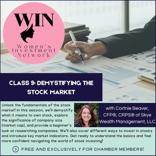 Women’s Investment Network June 25th from 7:30am-9am At the Chamber’s F&M Trust Training Room (1 S. Potomac St. , Hagerstown, MD 21740) Class 9: Demystifying the Stock Market with Cortnie Beaver, CFP®, CRPS® of Skye Wealth Management, LLC This exclusive Chamber members-only event is free to attend.