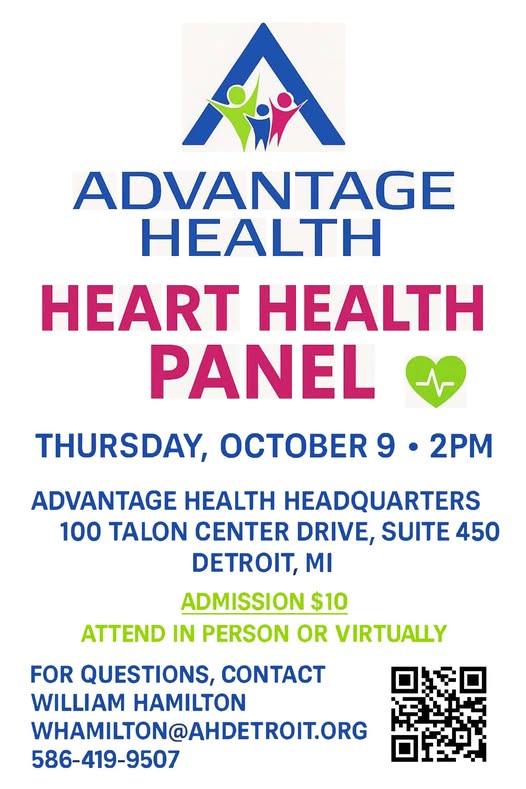 π Join Us for a Critical Conversation on Heart Health Equity Cardiovascular disease remains one of the leading causes of death in our community β but together, we can change that. Advantage Health is proud to host a Heart Health Panel on Thursday, October 9 at 2:00 PM at our headquarters (100 Talon Center Drive, Suite 450, Detroit, MI). This event will bring together clinical experts, community health leaders, and advocates to discuss how we can break down barriers, improve access to care, and advance cardiovascular health equity in Detroit.