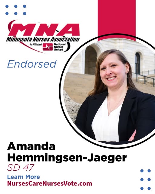 Nurses endorsed Amanda Hemmingsen-Jaeger for Senate District 47 because of her strong record on healthcare access and her leadership in addressing consolidation in healthcare. Nurses also appreciate that she deeply understands the issues nurses face, primarily short staffing, given that her mom and sister-in-law are both nurses. https://nursescarenursesvote.