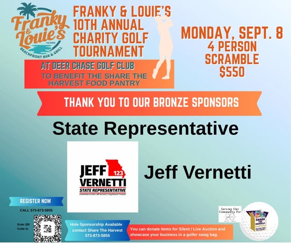 Thank you Missouri State Representative, Jeff Vernetti for your BRONZE sponsorship for our 10th Annual Charity Golf Tournament. If you or your company would like to be seen by 100+ golfers at our annual golf tournament, please reach out to us by end of day on Friday 8/29/2025.