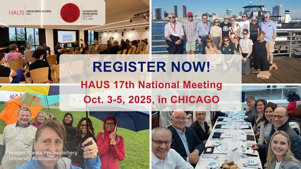 🌟We cordially invite all former students, exchange students, graduates, researchers, professors, and other friends of Universität Heidelberg to participate in the 17th HAUS National Meeting, taking place the weekend of October 3–5, 2025 in Chicago, IL. 🤝Join us as we reconnect with old friends, welcome new faces, and celebrate our shared ties with Uni Heidelberg. The weekend will feature inspiring talks, engaging discussions, a Chicago River Architecture tour, and plenty of opportunities for networking in one of America’s most vibrant cities.